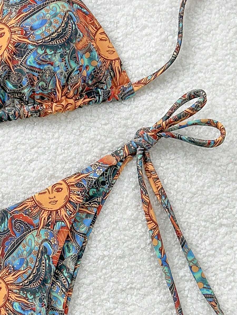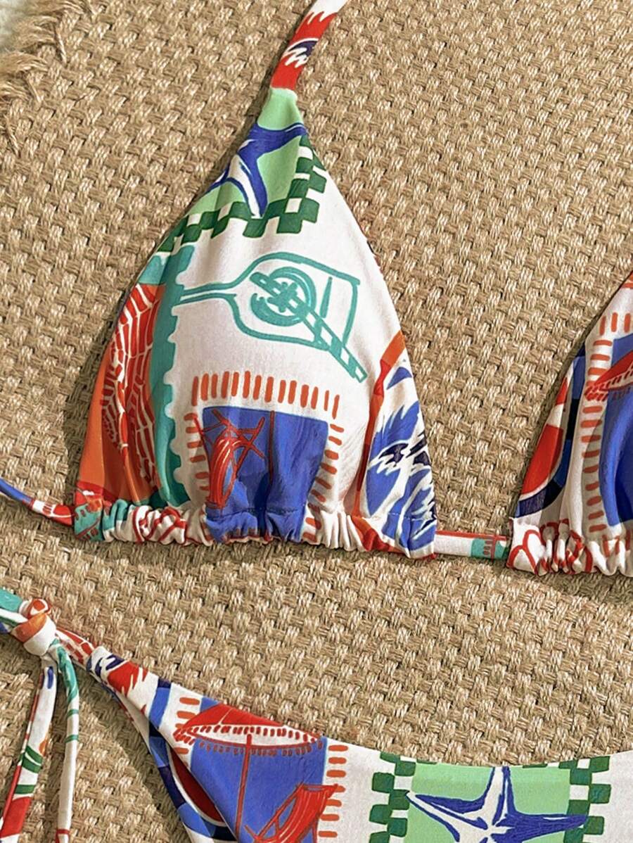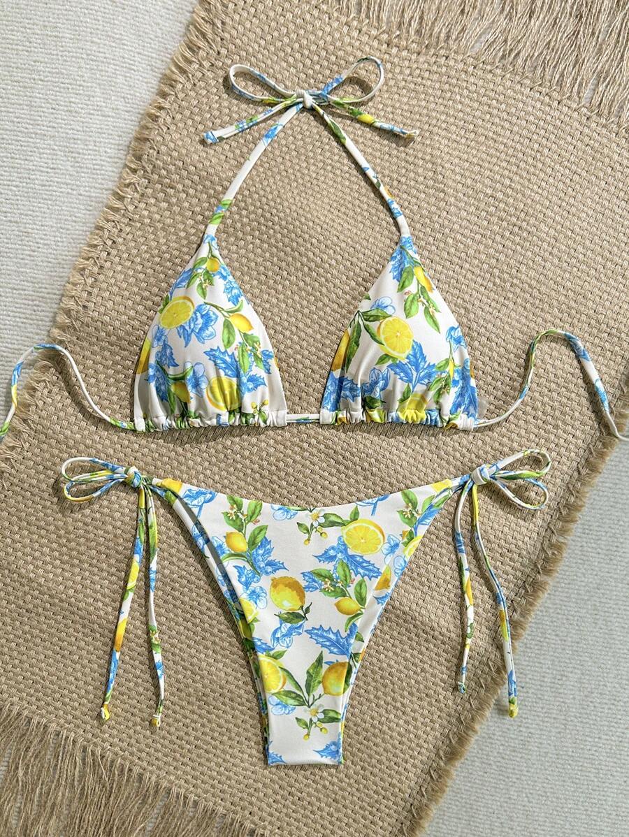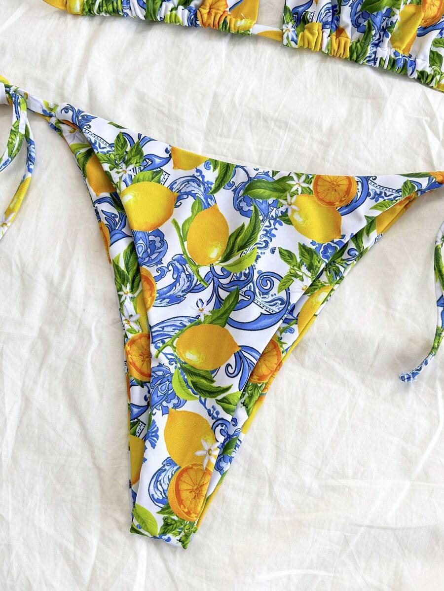 Biquíni vibrante em estilo cortininha com estampa artística de laranjinhas, perfeito para destacar a energia e alegria do verão.